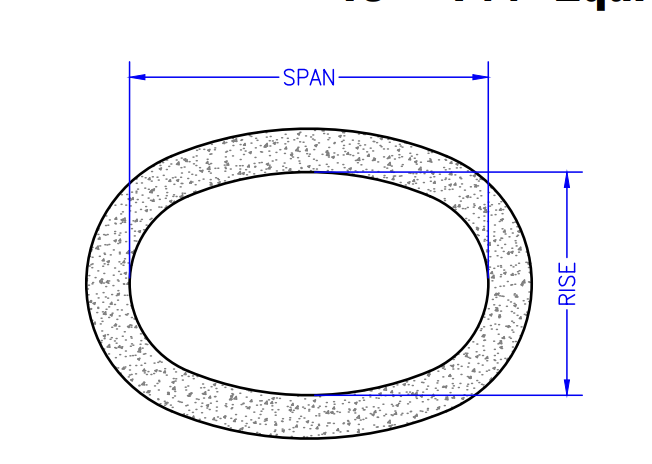 Equivalent Round Diameter (inches) | Nominal Rise (inches) | Nominal Span (inches) | Wall Thickness (inches) | Approx. Weight (lbs/ft) | Waterway Area (ft²) |